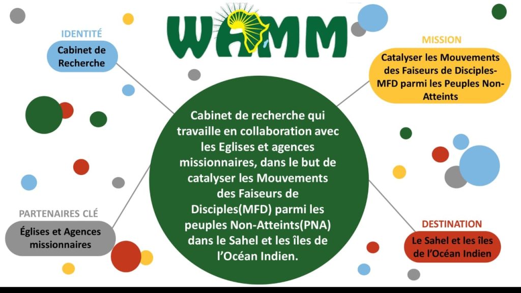 La West Africa Missionary Movements (WAMM) est un cabinet de recherche ethnologique qui travaille en collaboration avec les Églises et Agences Missionnaires dans le but de catalyser les Mouvements de Faiseurs de Disciples-MFD parmi les peuples non-atteints (PNA) dans le Sahel et les Iles de l’Océan Indien.